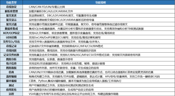 VSAR 是一款专业的国产汽车总线分析、测试、标定、诊断与仿真一体化工具软件,专为新能源汽车全生命周期提供高效、全面的解决方案。 核心架构优势: 模块化设计支持功能灵活扩展与接口调用,结合脚本编辑、流程编辑、面板及应用发布功能,可快速构建定制化版本(行业版/轻量版/增强版)。同时,通过硬件抽象层与接口标准化实现软硬件解耦,确保代码硬件无关性,提升多平台部署效率。 产品亮点: